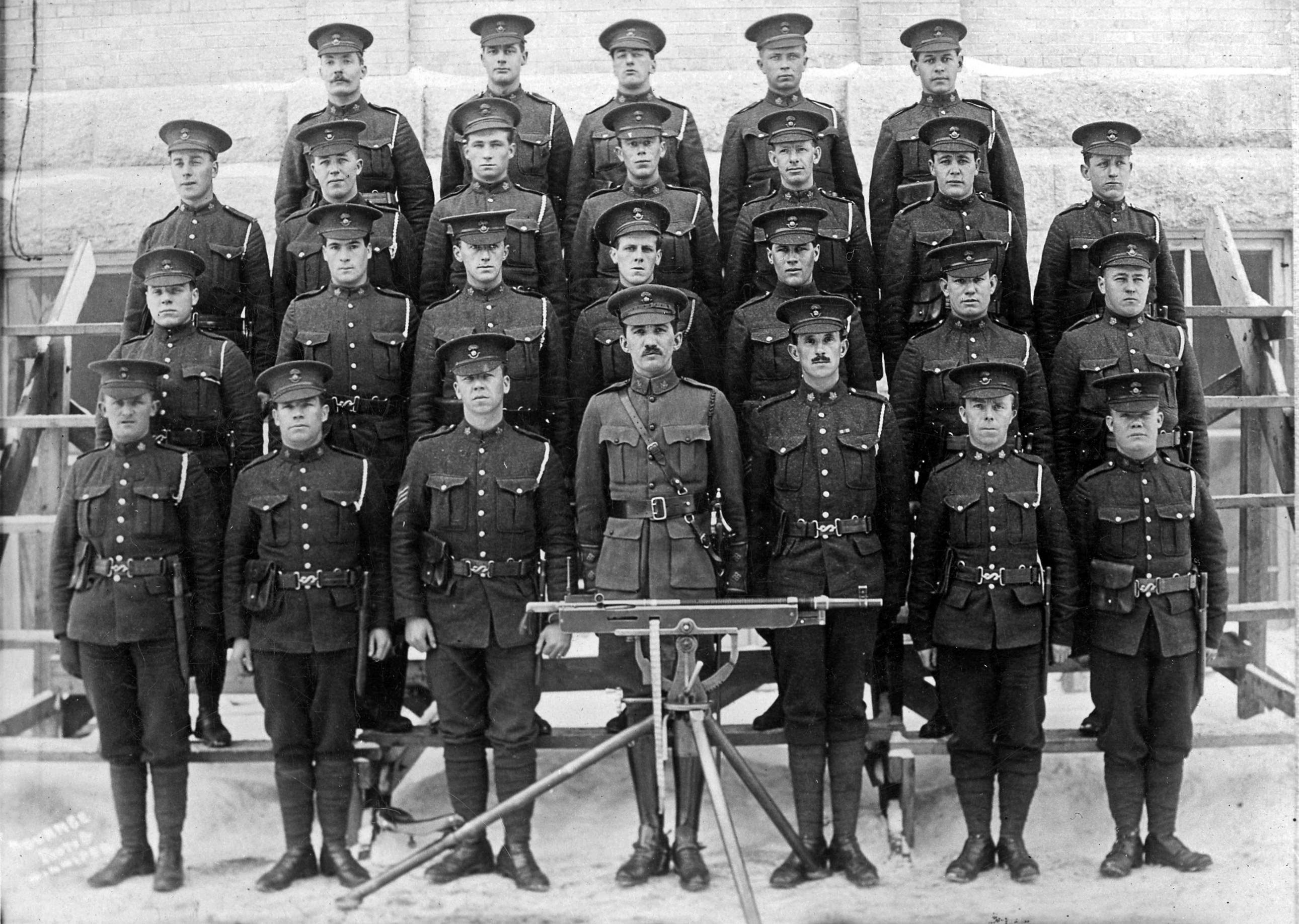 I believe that my grandfather, Frederick William Bishop is second from the left in the top row. This might have been in Canada before sailing for Europe in 1916.